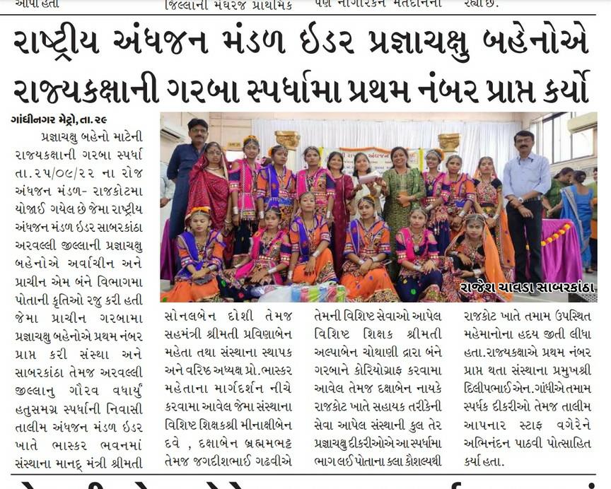રાષ્ટ્રીય અંધજન મંડળ ઇડર પ્રજ્ઞાચક્ષુ બહેનોએ રાજ્યકક્ષાની ગરબા સ્પર્ધામા પ્રથમ નંબર પ્રાપ્ત કર્યો ગરબા સ્પર્ધા વિડિઓ